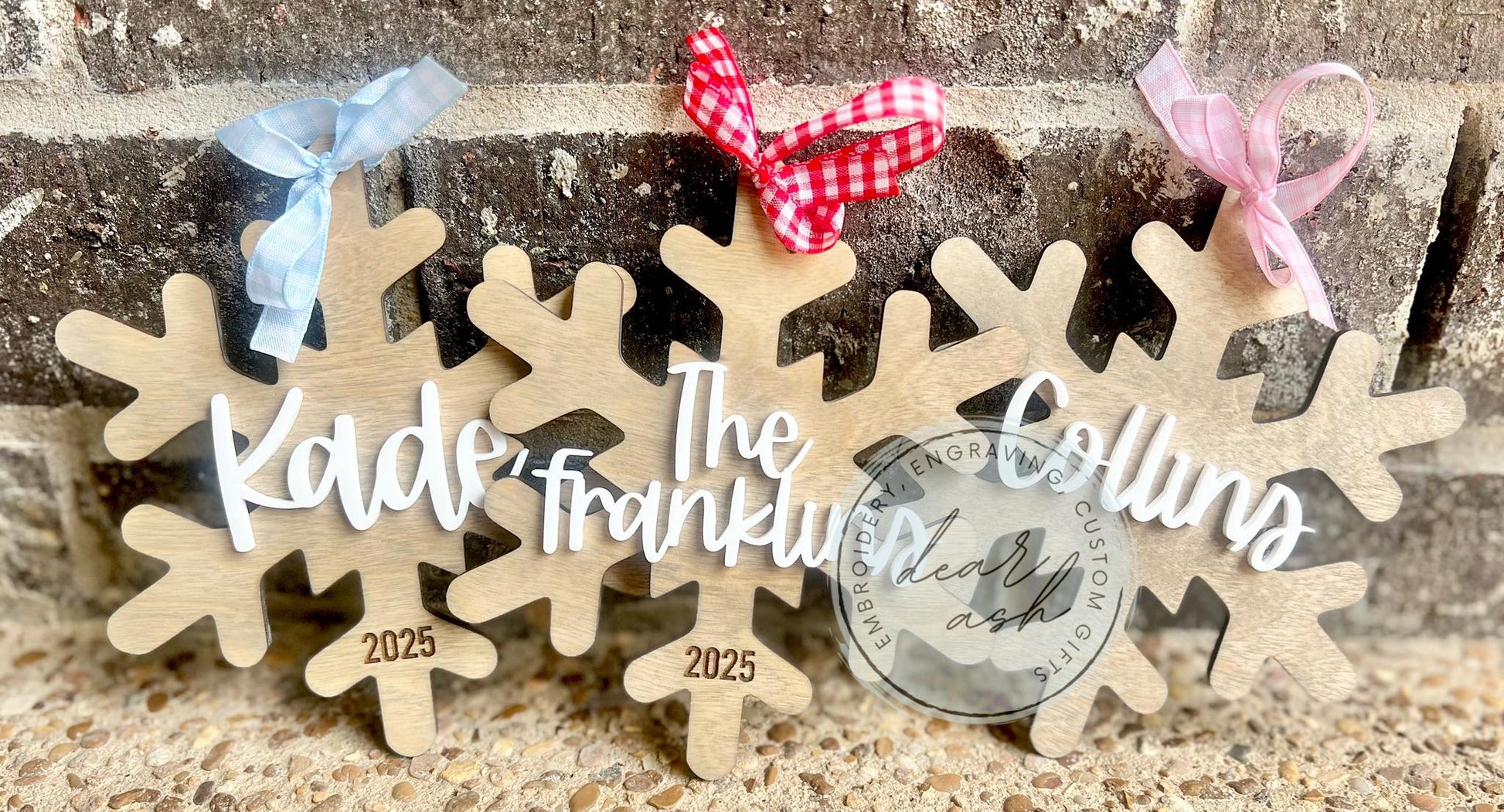 In the text box, tell me the name for the ornament & the ribbon color you'd like: pink, blue, or red.